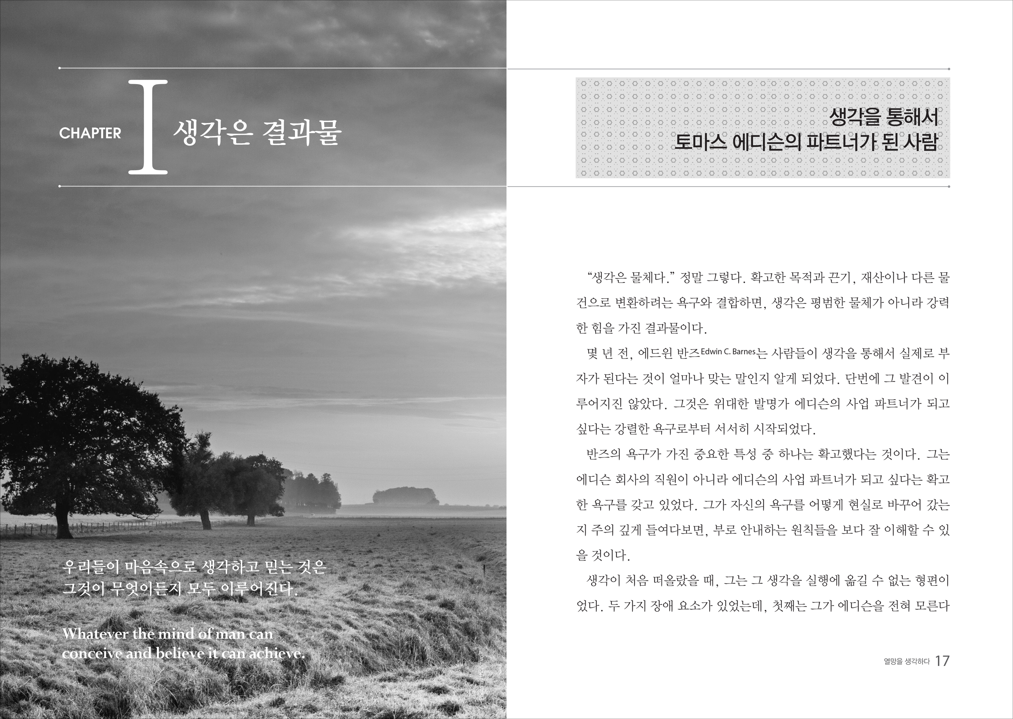 나폴레온 힐 (Napoleon Hill, 1883~1970)은 학비를 마련하기 위해 신문사 및 잡지사에 글을 기고하다가 <Bob Taylor’s Magazine> 기자로 앤드류 카네기를 인터뷰하게 되면서 인생의 전환점을 맞이하게 된다. 카네기는 그 누구라도 따르고 실천할 수 있는 원리가 성공으로 이어질 수 있다고 믿는다면서 힐에게 그러한 원리를 발견하기 위해 위대한 기업가들을 인터뷰할 것을 제안했다. 힐은 도전을 받아들였고, 1908년부터 1928년까지 20년에 걸쳐서, 앤드류 카네기가 알려준 성공한 기업가 507명을 직접 인터뷰하고 조사하여 성공의 원리를 정리해 20세기 최고의 성공 철학서로 평가받는 『Think and Grow Rich』를 출간했다. 나폴레온 힐은 일생 동안의 연구와 강연, 저술 활동을 통해서 미국을 비롯해 전 세계적으로 성공철학의 거장이 되었고, 특히 개인의 성취와 동기부여 분야에서 위대한 업적을 남겼다. 그의 주요 저서 『Think and Grow Rich』『The Law of Success』는 오늘날까지도 베스트셀러의 자리를 차지하고 있으며, 전 세계적으로 5,000만 부 이상 팔려 나갔다. 1970년 사우스 캐롤라이나에서 88세로 생을 마친 후, 그의 유지를 이어 시카고에 위치한 ‘나폴레온 힐 재단’에서는 힐의 연구 결과와 저술서를 중심으로 더 많은 사람들에게 성공 철학과 실천 프로그램을 전 세계에 보급하고 있다.