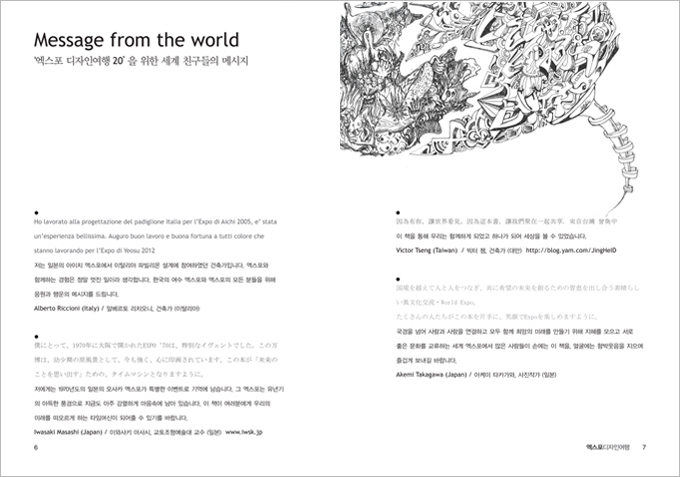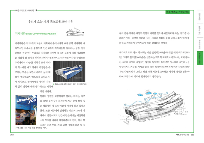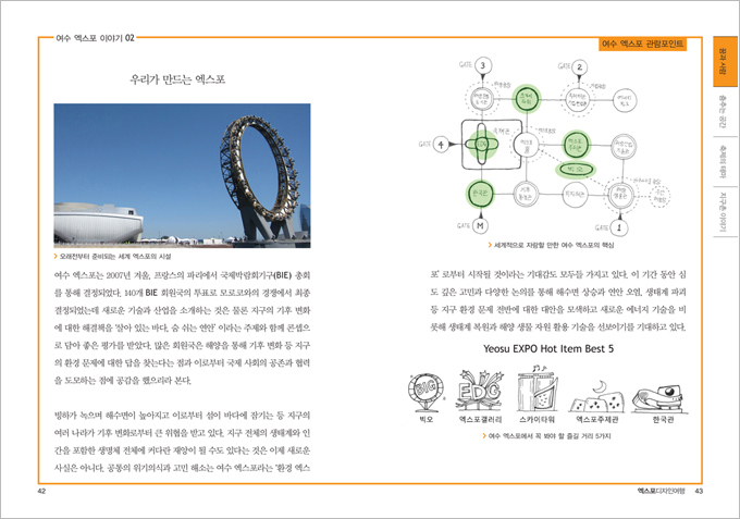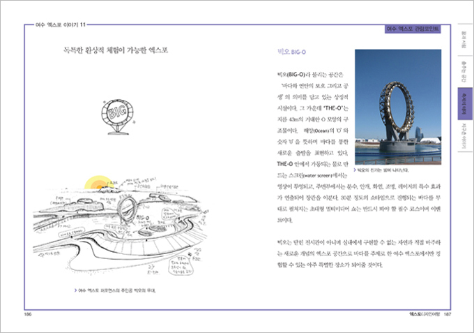 여수세계박람회를 즐기는 방법『엑스포 디자인 여행 20』. 이 책은 거대한 엑스포에서 시공간의 흐름과 감성의 변화를 공간 디자이너와 전시 연출가의 시점에서 보여 준다. 160년 인류의 역사와 함께한 세계 엑스포의 맥락을 사례를 통해 보다 알기 쉽게 설명하며, 미래 지향적인 가치를 중심으로 관람객의 시각에서 구성했다. 엑스포를 마주하는 20가지 시각을 세계 엑스포의 의미와 가치, 공간 구성과 주제 연출의 방법 등 4개의 키워드로 살펴본다. 기술 중심의 박람회에서 주제 중심의 박람회로 그 패러다임이 전환된 21세기에 박람회장에서 무엇을 생각하고 바라볼 것인지, 세계 엑스포에서의 공간적 경험으로 각자의 일상에서 재생산되는 무형의 가치는 또 무엇인지 느낄 수 있도록 도와준다.